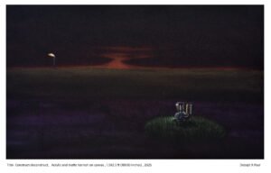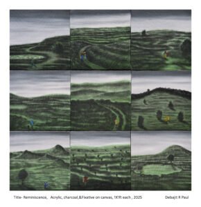 Debajit Rudra Paul’s paintings delve into themes of displacement, nostalgia, and transformation, often materializing as surreal landscapes infused with remnants of human presence. His approach is deeply rooted in scavenging expressions from everyday life and reimagining them in abstract, yet emotionally charged, environments.